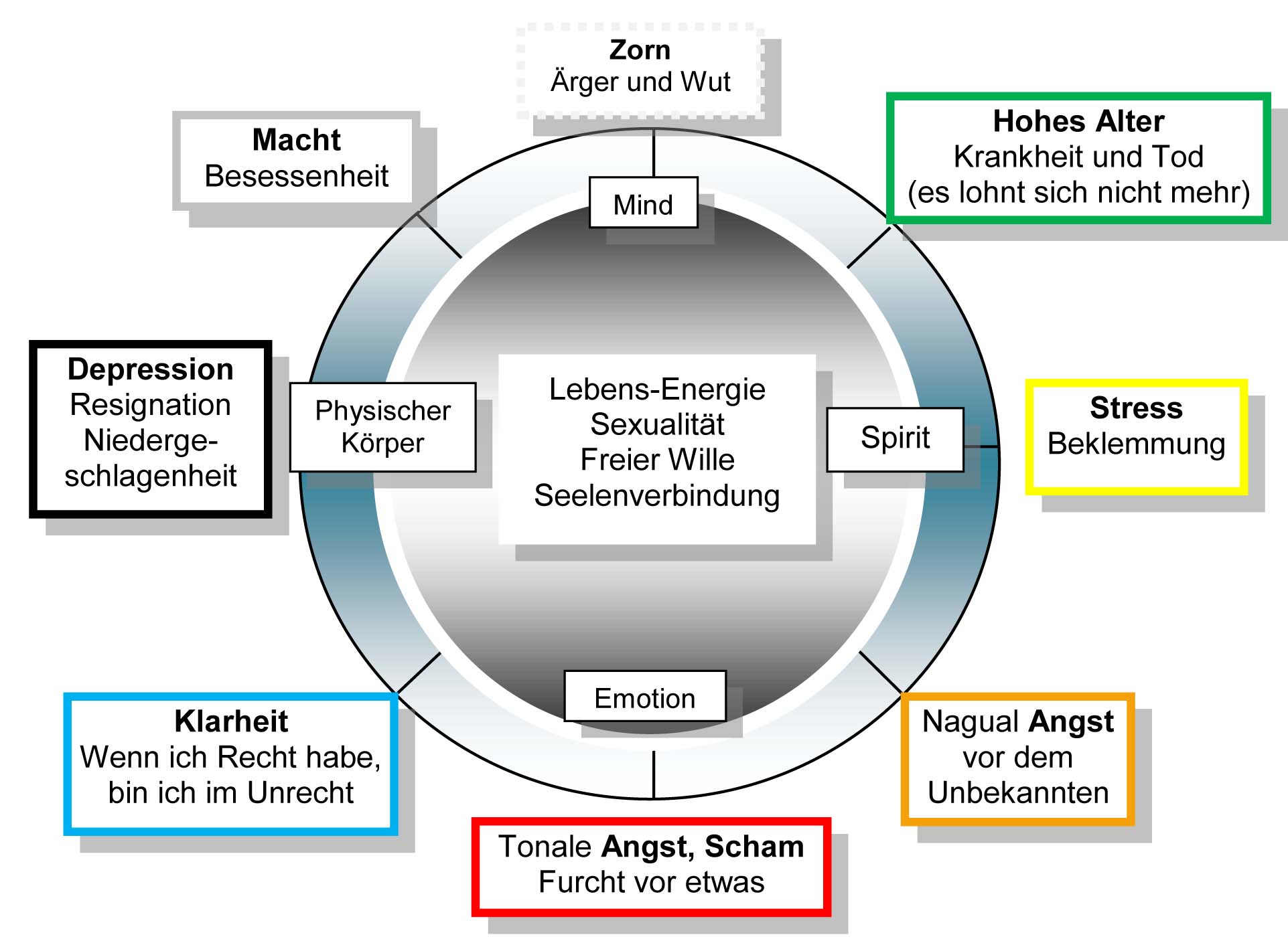 - Süden: Angst und Scham erschafft eineFurcht vor etwas Unbekannten. Wie die meisten dieser Feindbilder, sind sie dem Kinde als Erbe mitgegeben worden. Sie blockieren die ersten 3 Chakren und erschaffen somit viele Unsicherheiten im Emotionalkörper.