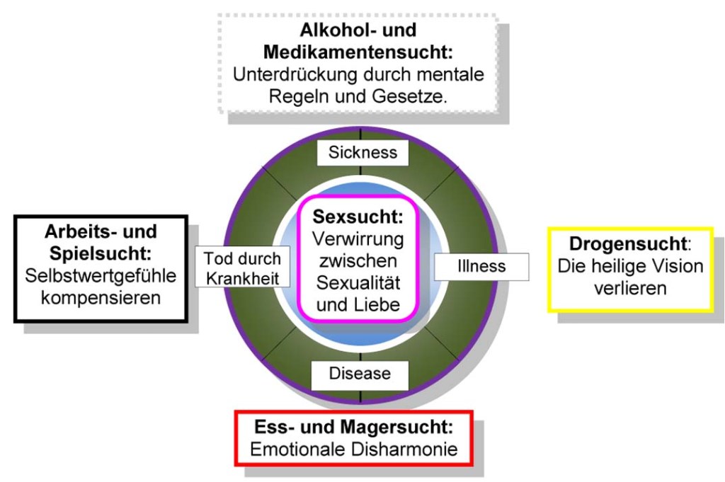 - Sexsucht: Im Zentrum des Rades angekommen, finden wir den Platz der Sexual- und Orgasmus-Energie. Beide gehören zusammen. Eine Verwirrung zwischen Liebe und sexueller Energie finden hier statt. Doch die Liebe hat Sitz im Herzen und bestimmt den Persönlichkeit-Sinn vom Selbst des 4., 5. und 6. Chakras. Die Sexual-Energie bewegt sich in den ersten 3 Chakren, die den genitalen Sinn vom Selbst bilden. Auch hier ist es die Eigenliebe, die Veränderung und Heilung bringen wird. Es ist das Verständnis für unsere Sexualität, die in ihrem Eigenwert angehoben werden muss, damit sie dem göttlichen Erbe entspricht, das uns mit dieser Schöpfer-Kraft überreicht wurde.