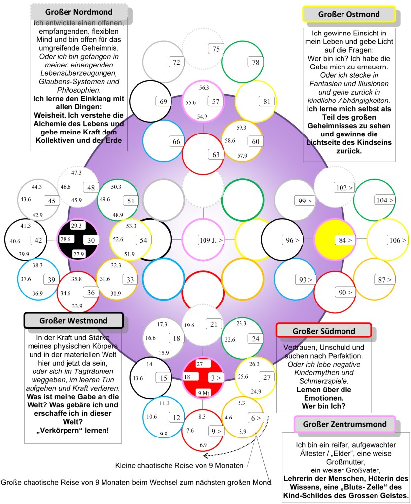 Für diese Lebensreise stehen uns Menschen 5 grosse Monde zur Verfügung, um Erfahrung der Trennung und Illusion zu ermöglichen. In allen 5 grossen Monden befindet sich in allen 8 Richtungen ein kleiner Mond, den wir in 3 Jahren durchwandern. Als Radnabe der Leere befindet sich im Zentrum der 9te Mond, der katalysierende kleine Mond, der uns im grossen Südmond den Start ermöglicht. Zusammen sind dies 9 Monde in denen wir uns jeweils 3 Jahre aufhalten. So dauert die Reise durch einen grossen Mond 27 Jahre, 3 Jahre mal 9 kleine Monde. Der Eintritt in einen Mond findet immer im Süden statt, dem Platz des Kindes oder des Erstgeborenen. Im Uhrzeigersinn geht die Reise vom Süden in den Westen, was 9 Monate dauert. Vom Westen in den Norden (weitere 9 Monate) und vom Norden in den Osten (weitere 9 Monate) wo der durchwanderte Mond verlassen wird.